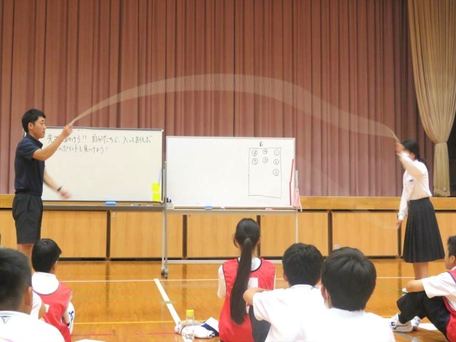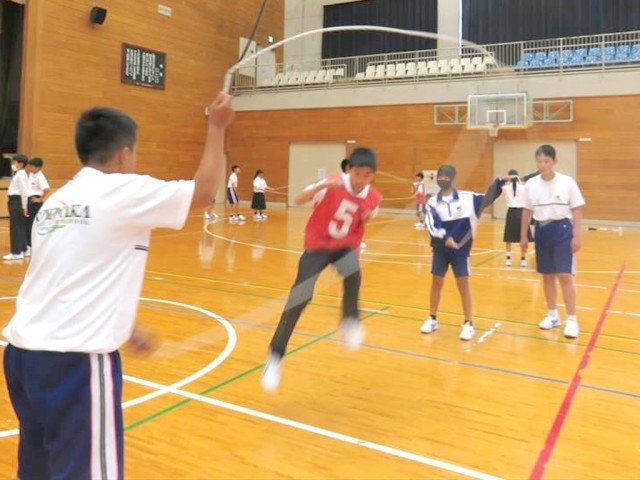 体つくり運動 公開日 2025/06/13 更新日 2025/06/13 1年生 2025年6月11日(水) 1年3組で体育の研究授業が行われました。「体つくり運動」を題材に、2本のロープを使うダブルダッチという縄跳びにチャレンジしました。自分たちでうまく跳ぶポイントを見つけるためにグループで交流しながら試行錯誤し、だれもが「できた」という達成感を味わうことができました。体を動かすことの心地よさに気づいた楽しい授業でした。