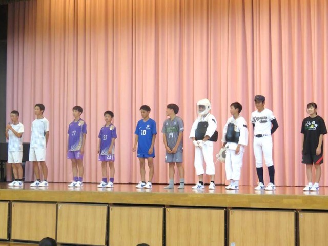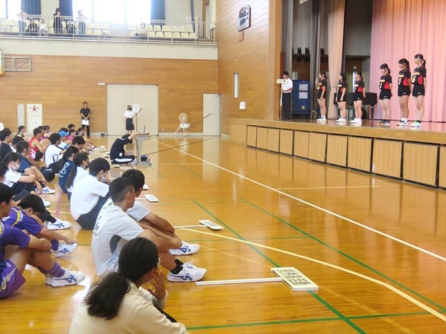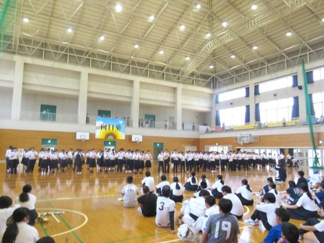 部活動激励会 公開日 2025/06/30 更新日 2025/06/30 学校全体 2025年6月27日(金) 部活動激励会が行われました。すべての部の3年生がステージに立ち、間近に迫った総体やコンクールに向けての決意表明をしました。後輩たちは声援や拍手を通して3年生にエールを贈りました。