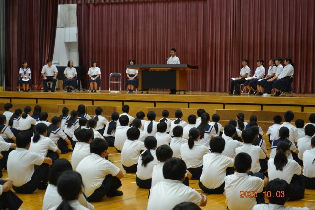 令和7年度 生徒会役員選挙立会演説会 公開日 2025/10/03 更新日 2025/10/03 学校全体 本日、令和7年度生徒会役員選挙立会演説会がありました。 立候補者は、高瀬中学校をよりよい学校にしたいという思いをもち堂々と演説を行いました。 全員が真剣に演説を聞き、一票を投じました。 新しい体制での高瀬中学校が楽しみです。