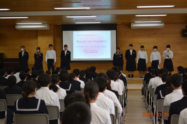 保健部委員の発表やスクールカウンセラーのお話などを通して、ストレスとの向き合い方や解消法を楽しく学ぶことができました。