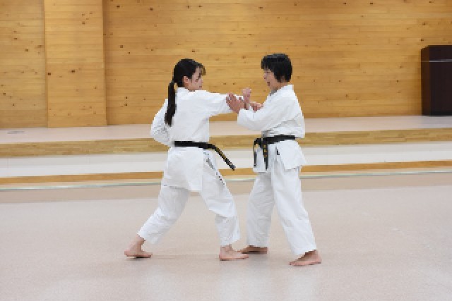 体育の授業では、ゲストティーチャーをお呼びして空手を体験しました。ペアでお互いの動きを確認しながら、空手の座礼や受けなどの基本的な動きに挑戦しました。また、実際の形を披露していただきました。動と静のある力強い動きに、皆圧倒されました。