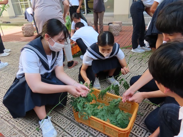 9月22日(月)3年生が育ててきたモリンガの収穫を行いました。日に日に成長し、3mを超える背丈に成長したモリンガの生命力には本当に驚かされました。スーパーフードと言われる片鱗がうかがえます。3年生が丁寧に摘み取った葉を乾燥させ、粉末状にしてその効能を味わう予定です。