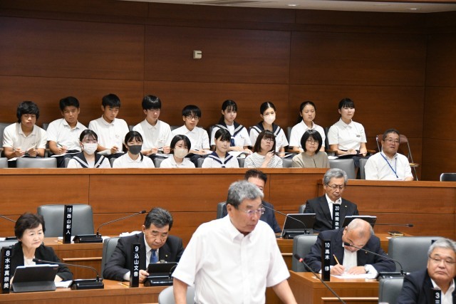 9月12日(金)三豊市議会からの招待により、3年生3クラスが9月定例議会審議の様子を見学させていただきました。夫婦別姓や太陽光パネル設置に伴う問題の改善、市役所職員の労働条件などについて真剣に話し合う様子に、3年後には有権者になる3年生も、聞き入っていました。