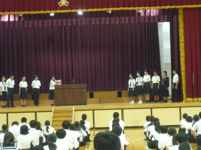 10月14日(火)、2日(木)の立会演説・投票を経て選ばれた1・2年生の新生徒会役員と3年生の旧生徒会役員の引継ぎ式が行われました。3年生からの思いを託された新生徒会が三野津魂をどのように引継ぎ、さらに高めてくれるのか楽しみです。
