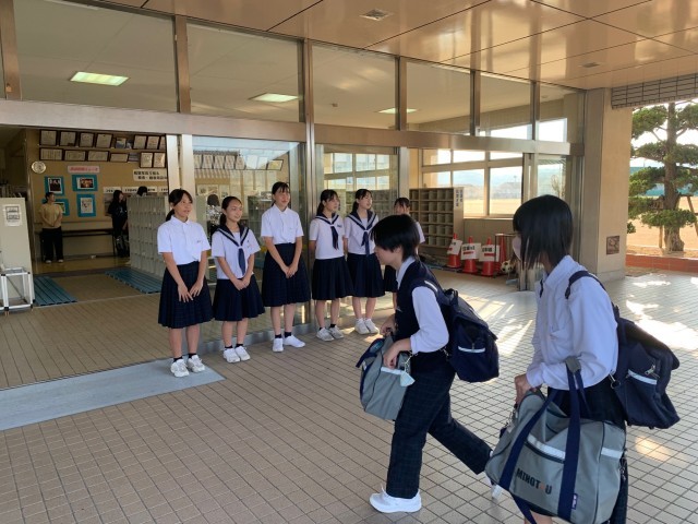 静止画ではお伝えしづらいのですが、現在、「第2回部活動対抗あいさつコンテスト」を実施中です。普段、よくあいさつができていると思う部を、自分の部以外から選んで投票するというもので、校外クラブもエントリーできます。3年生中心で1学期実施の第1回では、男子陸上部が1位となり、その後「四国総体で学校優勝」という好成績を残しました。「競技力とともに、人間力も磨く」部活動の地域展開が進んでも残していきたい日本の部活動の財産の一つです。1・2年生中心の第2回では、どの部が1位となるでしょうか。自主的に朝の生徒玄関に立ってあいさつする部も登場。投票は31日(金)。