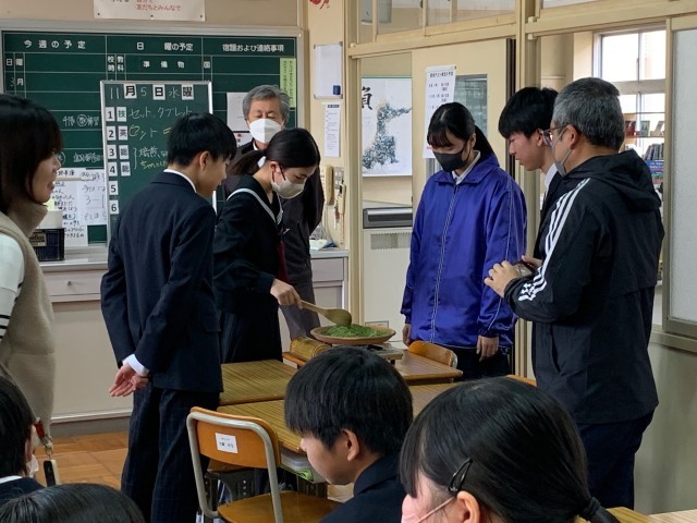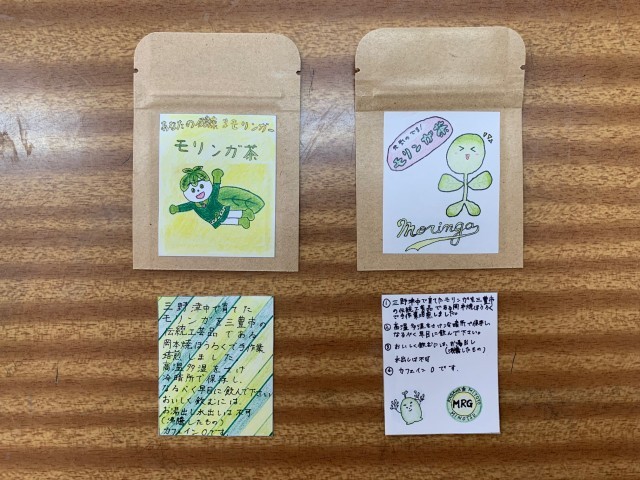11月5日、3年生が収穫したモリンガの葉を乾燥させて細かく茶葉状にしたものを、焙煎して小袋に詰める作業を行いました。小袋には各班がモリンガをイメージしたキャラクターと、裏にモリンガの効能が説明された文章を貼っています。これは、11月7日に本校で行われる「香中研学校給食部会研究発表会」に来校される県下各校の栄養教諭や家庭科の先生、給食主任の先生方にお持ち帰りいただきます。喜んでいただけるかな?