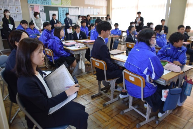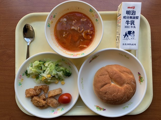 11月7日(金)県学校給食研究発表会のもう一本の授業が、2年国語科の「意見文を書こう」の中で「食事の肉を、すべて代替肉に置き換えることに賛成か」です。かつて、某カップ麺メーカーが「謎肉(代替肉)の生産量世界一は、香川県です」とツイートしたのを受けて、本校の卒業生で俳優の要潤さんが「うどん県改め謎肉県」「さぬきうどんに謎肉かけ放題もおもしろい」とユーモアあふれるツイートをしたことから、授業を導入しました。そして、「今日の給食のメニューにも、代替肉が出ていたんだよ。」という展開に。このメニューは、夏休み中に栄養教諭と調理員が試作を重ねておいしく仕上げた自校給食ならではのものです。県の指導主事からも「授業と給食を絡めた点は、さすがでした。」とのお言葉をいただきました。
