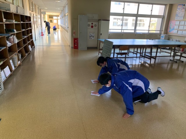 本校に赴任以来、感心していることの一つがこの「黙働清掃」です。清掃時間中に、いろいろ校内を歩いても、本当に誰もしゃべることなく清掃していますし、校長室でいると前の廊下は清掃しているのかいないのか気配が感じられないほど静かに清掃に取り組んでいます。古来より、禅宗では問答の前の「挨拶」と「掃除」は、重要な修行と位置付けられてきました。もちろん宗教的な意図はありませんが、どちらも心を鍛えるよい修行になると思います。これからも、元気な挨拶と無言の清掃が続く三野津中学校であり続けたいと思います。