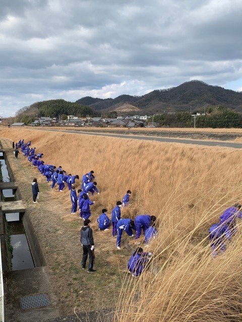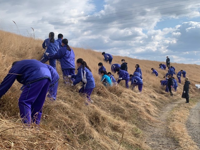 1月30日(金)、2年生が総合学習(ふるさと学習)の一環として、また、15歳(「立志」)になる年に地域に貢献するという意味合いも込めて、高瀬川の土手の草刈りをしました。約1時間程度でしたが、土手の急な斜面を慣れない草刈り鎌を持って、予定した区間をきれいにすることができました。2年生もあと2か月で3年生、2か月半で修学旅行です。2年生たちも、「3年生になったら頑張らんといかんと思っているな」「期待できそうだな」と思えた河川清掃でした。