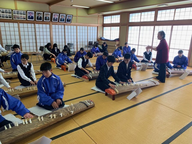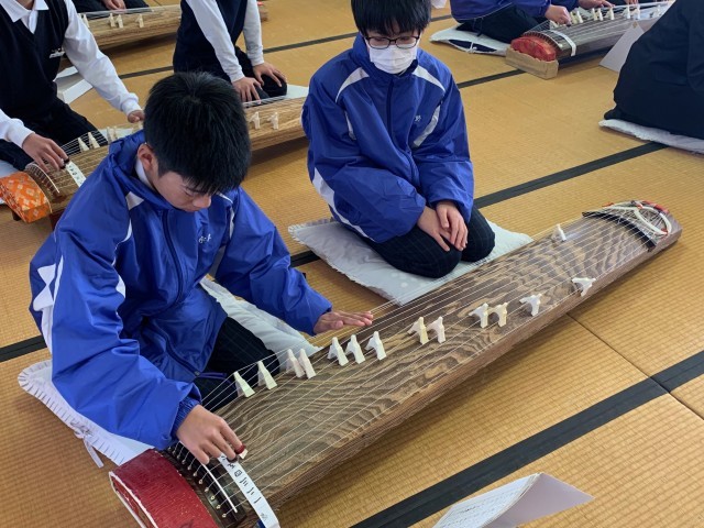 2月5日と6日の2日間、1年生が音楽の授業で各クラス計2時間、箏(琴)の演奏に取り組みました。専門の先生に講師としてお越しいただいて指導を受けた結果、2時間目にはもう、全体で「さくら さくら」を合奏できるまでになりました。「2時間でこんなにすぐ弾けるようになるものなのか」と驚くとともに、校内に響く雅(みやび)な音に、使われる機会の少ない修礼室の畳たちが喜んでいるように感じました。
