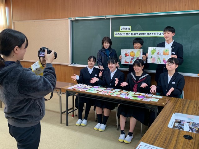 2年生が美術の授業で取り組んだ「三豊市の特産くだもの・野菜」の絵手紙が、市の広報に掲載されることになり、2月6日(金)に取材を受けました。これは、11月の県学校給食研究発表会に向けて各教科で食育の取り組みを行った一環で、本校美術科教員が出来上がった絵手紙を三豊市へのふるさと納税の返礼品に同封することを提案した結果、採用されたことに対する取材です。三豊市のおいしい特産品についてよく知るとともに、「全国の誰かが手に取って見てくれる」、または「三豊市を代表する」というモチベーションは作品作りにも十分生かされたことでしょう。広報「みとよ」3月号に掲載予定です。