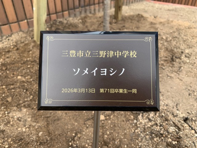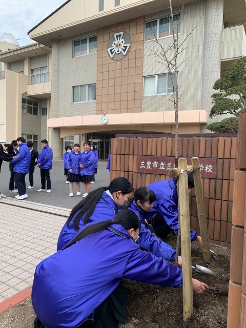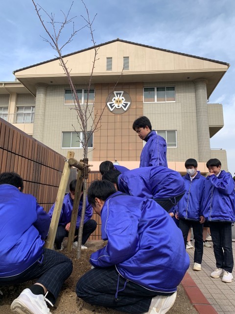 卒業式まで、いよいよあと3週間となった2月24日(火)、3年生が卒業記念品として学校に寄贈してくれるソメイヨシノの植樹を行いました。かつては正門の両端にあった桜が1本のみになり、その1本も一部分を除いて枯れていました。やはり日本の学校に桜の木は欠かせません。今はまだ、か細い苗木ですが、大きく成長して花を咲かせ、中学校生活への希望に胸を膨らませて入学してくる後輩たちを見守ってくれることでしょう。今年度、素晴らしい「三野津魂」を示してくれた3年生の勇姿とも重ねつつ、桜の木の成長を楽しみに見守りたいと思います。生徒の皆さん、保護者の皆さん、御寄贈ありがとうございました。