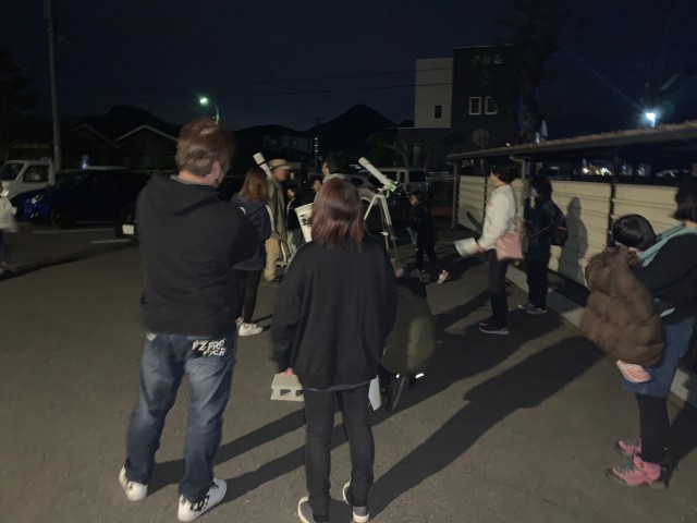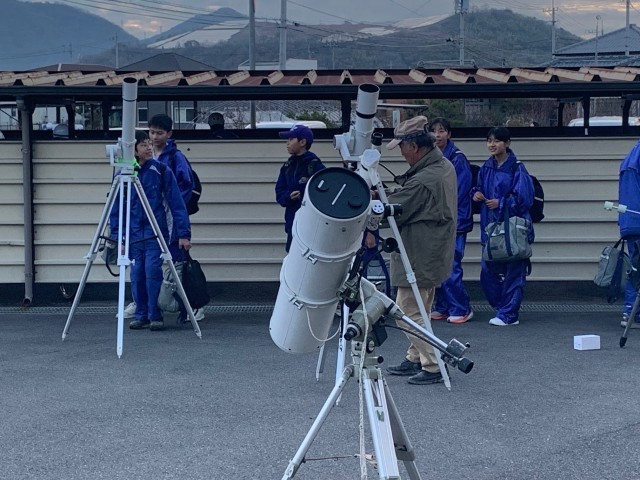 2月26日(木)公民館行事の「星を見る会」が、本校で開催されました。町内の天文愛好家所有の望遠鏡が駐車場にズラリ。部活終わりの本校生徒何人かも月のクレーターを見ることができました。夜になると、小学生の親子連れが30人ほど参加し、歓声をあげていました。今回は、見たい方角や高度が合わず、屋上の天体ドームにある大望遠鏡は使いませんでしたが、次回はぜひ活用してもらいたいと思います。電動でドームが開いて、見たい位置を合わせることのできる学校の「現役望遠鏡」は珍しいそうです。