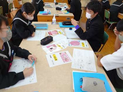 の場面で、アレルギー対応や価格等を考えながら、どのハムを選択するかを考えていました。みんなしっかり考えられていました。
