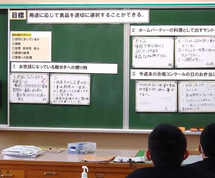 食品の選択と保存:目標「用途に応じて食品を適切に選択することができる」で、2年生が学習しました。食品表示をみて食品の情報を収集し、
