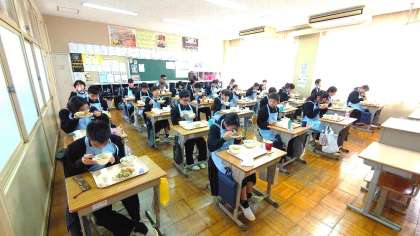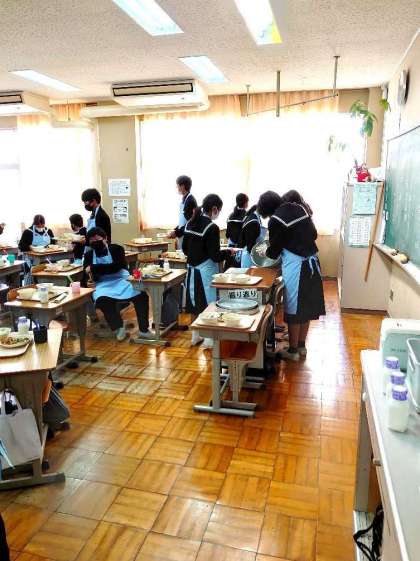 新型コロナウイルス感染対策として、セルフサービス方式を採用しています。1年生の様子ですが、感染対策を行いながら手際よくできています。食べるのも一方向に向いての黙食を行っていますので、音楽を流し、少しでも食事が楽しくなるように工夫しています。
