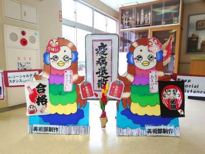 玄関で、三野津中生を見守っている「アマビエ」が、受験に向かう3年生の合格を祈っています。進路決定の3年生とともに、在校生・教職員一同、応援しています。