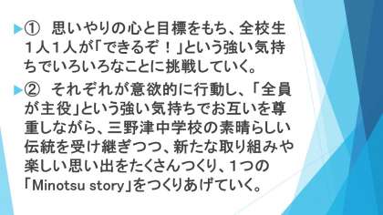 先輩から受け継いできた思いをもとに、新しいスタートを切るにあたり、昨年度3学期に、「スローガン」を決定しました。生徒会より、発表されたスローガンに込めた思いと決意は、今年も素晴らしいものです。実現に向けて、有言実行です。