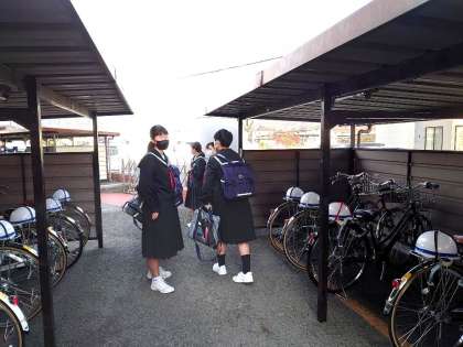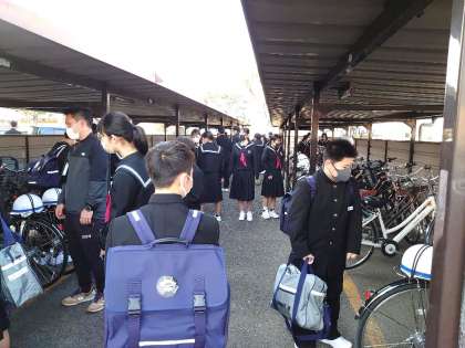 昨年度より始めたボランティアです。3年生・2年生が1年生に、「挨拶、自転車の置き方、ヘルメットのくくり方」の支援ボランティアを始めました。今日は3年生、優しい先輩に感謝!