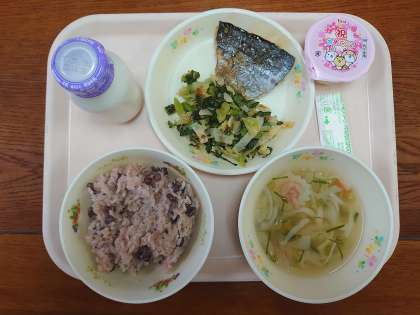 赤飯 牛乳 さわらの照り焼き 野菜のポン酢あえ ふしめん汁 お祝いデザート