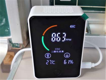教育委員会が配置くださった「二酸化炭素換気モニター」を、各学級に設置して利用しています。二酸化炭素濃度を1000ppm以下になるように換気をして、感染症対策を行っています。今までは、換気優先で教室内の室温が下がりにくかったのですが、モニターを見ながら対応できるようになりました。