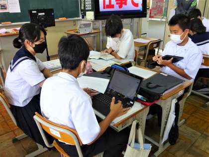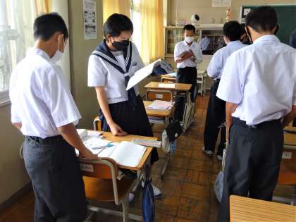 英文で書かれた資料から児童労働の実態を読み取り、意見交流を行い、自分たちができることを考えて、英文で表していました。