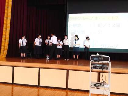○ 1回目では、席を決めるのに時間がかかって、楽しかったけど遊ぶ時間が少なくなってしまった。2回目は、昼休みに○○の場所の確認をしていて時間通り、集合で来ていて予定通り動いていてすごく楽しかった。効率が悪かったのか5問しか解けませんでした。正解数が多い班に商品を贈呈するの、いいと思いました。優勝した班の感想を聞くのもいいと思いました。「最高です」と答え合わせがとても面白かったです。あそBONで、全校生と交流できて、楽しい時間を過ごせて、最高でした。ありがとうございました。