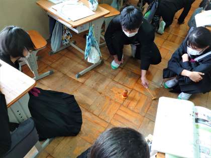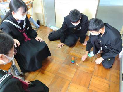 にぎやかな声が聞こえてきたので、教室に入ると、「だるま落として、1段だけ落とした時の上の部分の運動」を調べようで、各グループ活動していました。童心に戻って、楽しそうに、真剣にチェレンジしていました。成功・失敗に一喜一憂でした。