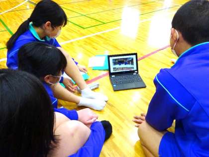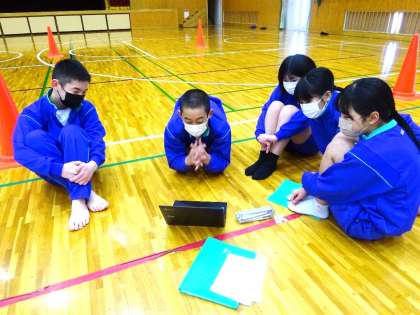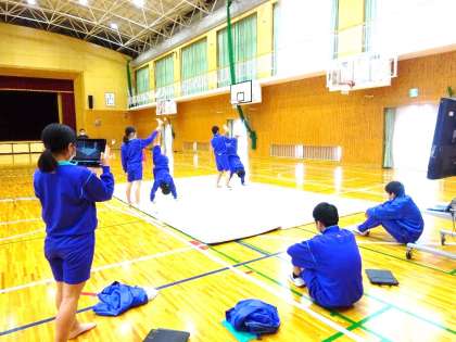 今日は、「次時の発表会に向けて、動画を確認し、自らの演技の最終確認ができる。」として、お互いに「演技」の撮影を行い、自身の演技の確認・練習と学習を行っていました。次回は、「演技発表会」です。