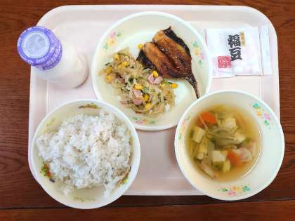 <献立>麦ごはん 牛乳 節分豆 いわしのかば焼き風 だいこんサラダ すまし汁