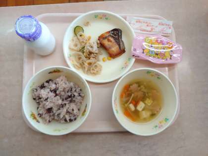<献立>赤飯 牛乳 ぶりのてり焼き れんこんサラダ すまし汁 三色ゼリー _____