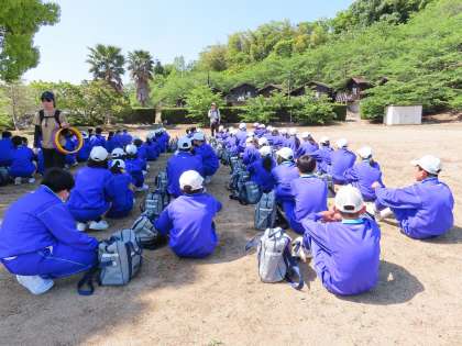 2年生は校外学習で粟島へ行きました。まず、船に乗って粟島に渡り、ルポール粟島に集合しました。