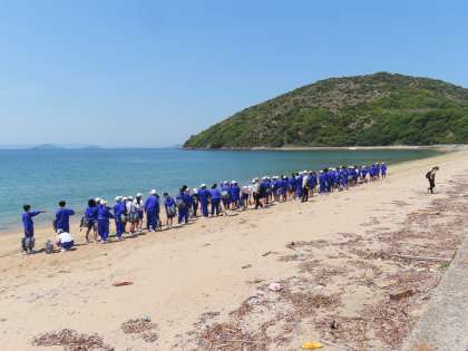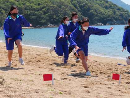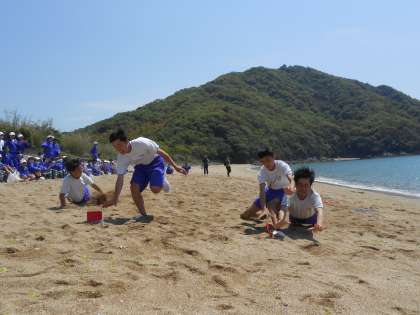 登山の後弁当を食べ、西浜へ行きました。きれいな砂浜でゲームをして楽しみました。