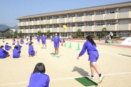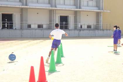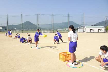 3年生がが団種目の練習をしました。種目名は「Try! ONE TEAM」ラグビーボールを投げたり、かごに入れたり、持って走ったりします。