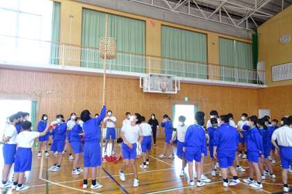 5時間目に生徒会種目の説明があり、縦割りグループに分かれて作戦を考えたり、練習したりしました。