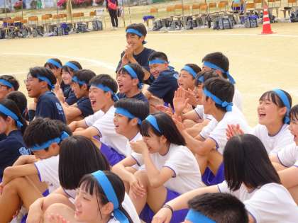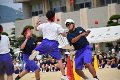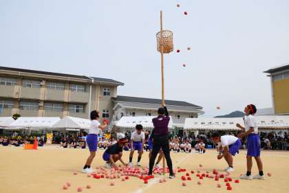 縦割り学級による玉入れです。各クラス6チームによる総合戦でした。後半は逃げるかごを追いかけて玉を入れる種目も追加され、勝負を分けました。各クラス、応援も盛り上がりました。
