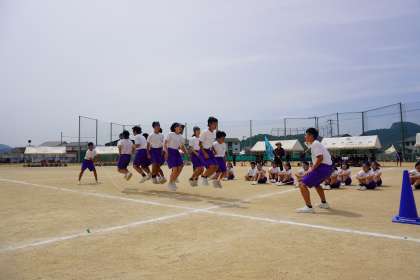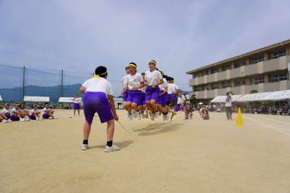 2年団種目は、We are Big rope challengers! 略してWBCです。長縄跳びの回数で競いました。跳ぶ人も、綱を回す人も必死です。結果は2組が1位でした。