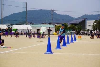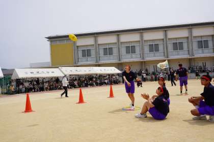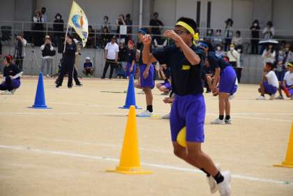三年団はTry! ONE TEAM というラグビーボールを使った競技をしました。ボールを投げたり、足に挟んで運んだり、ジグザグに走ってゴールにトライするという変化のある競技でした。結果は3組が1位でした。