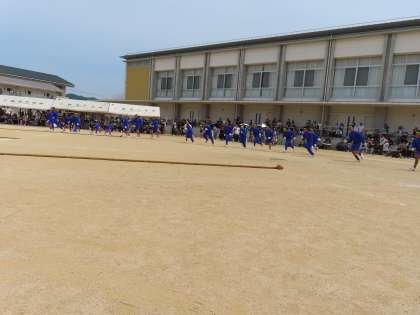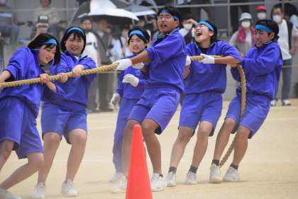 生徒会種目の「ウルトラ綱引き」は縦割り競技です。3本用意された綱まで走って行き、多く引っ張った方がポイントをたくさんもらえます。作戦タイムも使い、知力と体力を出し切りました。勝負は縦割り3組チームが1位でした。