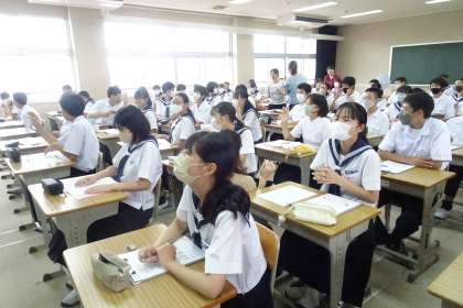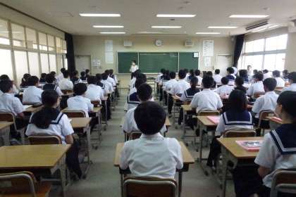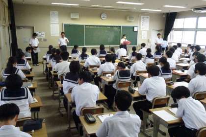 2年生が、9月に行う職場体験学習に役立つように、マナー講座を行いました。声の大きさや表情、態度などについて学び、最後には実際に学んだことをやってみました。