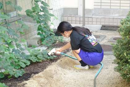 夏休みの間も環境委員が水やりをしてくれて、グリーンカーテンが成長しています。ゴーヤが3つほど実っています。