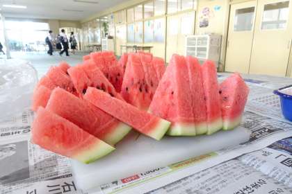 2個目のすいかを収穫し、補習に来ていた3年生で分けて食べました。おいしかったです。