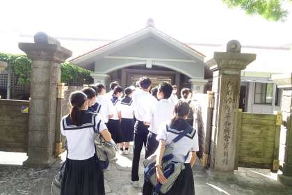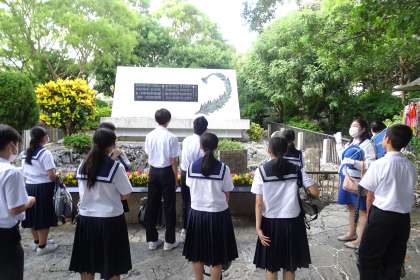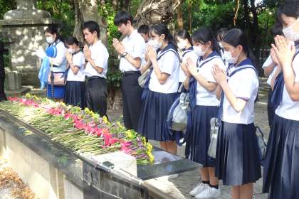 修学旅行1日目 ひめゆりの塔 公開日 2023/09/10 更新日 2023/09/10 3年生 令和5年9月6日(水) 当時の女子高校生たちが看護助手として動員され多くが亡くなった壕の跡、ひめゆりの塔を訪問して黙祷しました。その後、平和祈念資料館を見学しました。