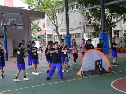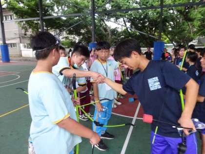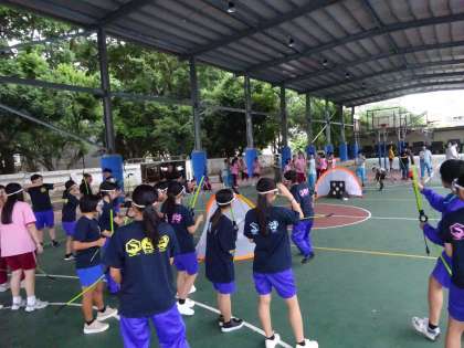 アーチェリー体験をしました。最後に、2チームに分かれて、相手の的の当てるゲームをしました。