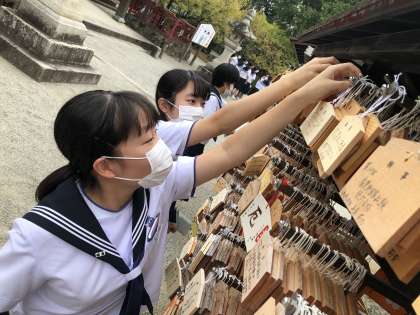 新型コロナウイルス感染予防のため、本年度は県内日帰りの修学旅行となりました。1日目は、滝宮天満宮とレオマワールドでした。絵馬に願いを込め、真剣に祈る生徒たちでした。おみくじにも一喜一憂!