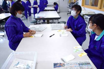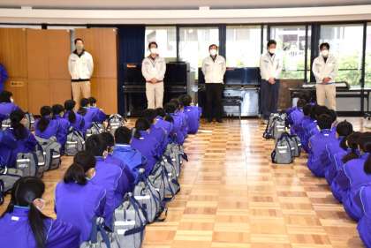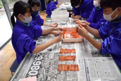 感染拡大防止のため、宿泊をともなう学習は中止となり日帰りでの学習となりました。曇り空ではありましたが、自然の中での学習は新鮮であり、生徒たちも楽しく学習していました。午前中は、室内学習(葉脈標本、草木染め、藍染め、岩石標本、化石標本)でした。