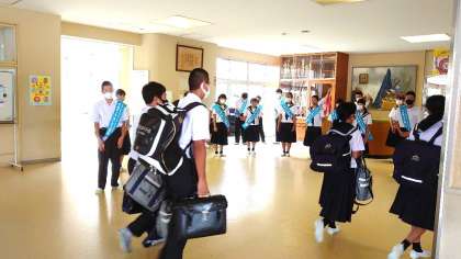 1学期、最後の挨拶ボランティアでした。「マナーアップ・リーダー」のたすきをつけて活動していました。朝の挨拶は、とても気持ちがよいものですね。