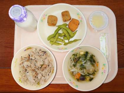 <献立>ひじきごはん 牛乳 かぼちゃのかのこ揚げ えだまめの塩ゆで ふしめん汁 レモンゼリー
