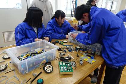 2年生の技術の授業で、プログラミング授業の前段階となるロボットの組み立てをしました。香川高専の先生に教えてもらながら、レゴを組み立ててロボットを作り、対戦ゲームをしました。ロボットの動きなどを見て、それをもとにこれからプログラミング授業へとつなげていきます。