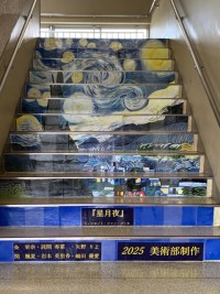 美術部が渾身の新作:階段アート『星月夜』(ゴッホ作)を展示公開してくれました。他...